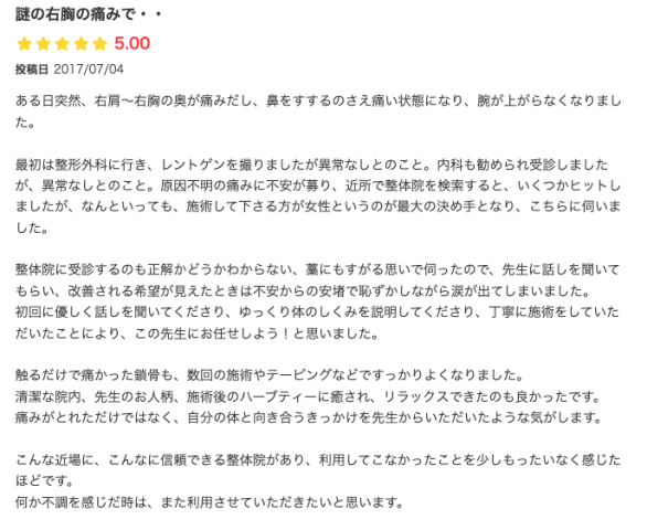最初は整形外科に行き、レントゲンを撮りましたが異常なしとのこと。内科も勧められ受診しましたが、異常なしとのこと。原因不明の痛みに不安が募り、近所で整体院を検索すると、いくつかヒットしましたが、なんといっても、施術して下さる方が女性というのが最大の決め手となり、こちらに伺いました。