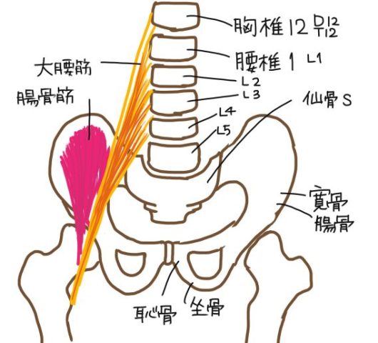 背骨(胸椎きょうついの一番下と腰椎ようつい)から、骨盤(こつばん)を通って大腿骨(だいたいこつ・腿ももの骨)についています。