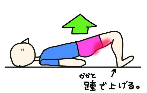 ヒップリフト、という名称で有名ですが、単にお尻を上げるのではなく、踵(かかと)を使ってお尻を上げましょう。