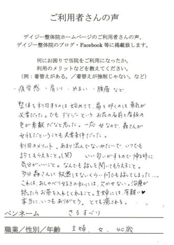 「疲労感・肩こり・めまい・腰痛など」のさるすべりさんからエキテ... ブログ 2016.12.22 「疲労感・肩こり・めまい・腰痛など」さるすべりさんhttp://www.ekiten.jp/shop_6000933/review/k_2523121/2010年からデイジー整体院を利用しています。整体を利用するのは初めてで、扉を叩くのは勇... 続きを読む