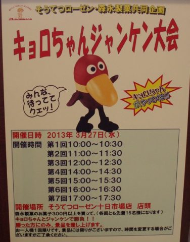 キョロちゃんジャンケン大会atローゼン十日市場店(2013年3... ブログ 2013.03.17 ローゼンにキョロちゃんがいらっしゃるらしい☆ローゼンにキョロちゃんが来る。先ほど買い物に行ったら レジ出て買い物を袋に詰める台の ところでポスターを見かけました。↓ポスター抜粋↓そうてつローゼン・森永製菓共同企画キョロちゃんジャンケン大会開... 続きを読む