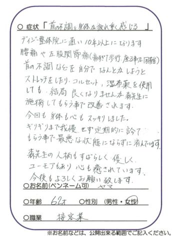 首の不調と身体が疲れ重く感じる/ヤマさん/62歳接客業女性